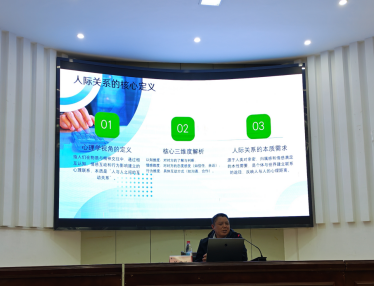 紧接着,讲座正式锚定“大学生人际交往心理健康”的核心主题展开深入讲解,主讲人从心理学视角出发,梳理了大学生在人际互动中常见的认知偏差与情绪困扰——从因害怕被拒绝而回避社交的“社交焦虑”,到因缺乏边界感导致的相处矛盾,再到因沟通不畅引发的关系内耗,每一个话题都紧扣大学生的心理状态与校园生活实际。这些精准的剖析让现场同学频频颔首,大家的注意力始终聚焦在讲解内容上,有人会偶尔在笔记本上记下关键的心理学术语,也有人陷入短暂的沉思,试图从专业视角重新审视自己的人际交往模式,报告厅里形成了一种专注而沉静的聆听氛围。