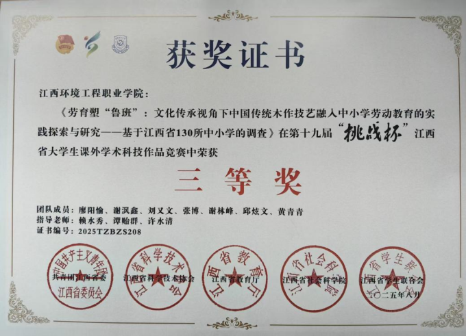 竞赛成绩斐然:学生在第五届全国职业院校林草技能大赛高职组精细木工比赛获得二等奖,学生团队作品“匠心木艺”获全国大学生数字媒体科技作品及创意竞赛全国总决赛三等奖、江西省赛区二等奖;获第十四届“挑战杯”江西省大学生创业计划竞赛金奖、第十四届“挑战杯”秦创原中国大学生创业计划竞赛银奖;获第十九届“挑战杯”江西省大学生课外学术科技作品竞赛三等奖。师生在多项高规格赛事中表现突出,助力专业成为区域木业人才培养标杆。