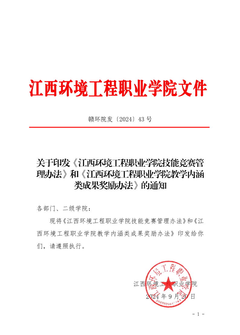 关于印发《江西环境工程职业学院技能竞赛管理办法》和《江西环境工程职业学院教学内涵类成果奖励办法》的通知 来源: 发布时间:2024-09-20 14:55:53 浏览次数: 次 【字体:小 大】 终审:jwc001 分享到: 【打印正文】