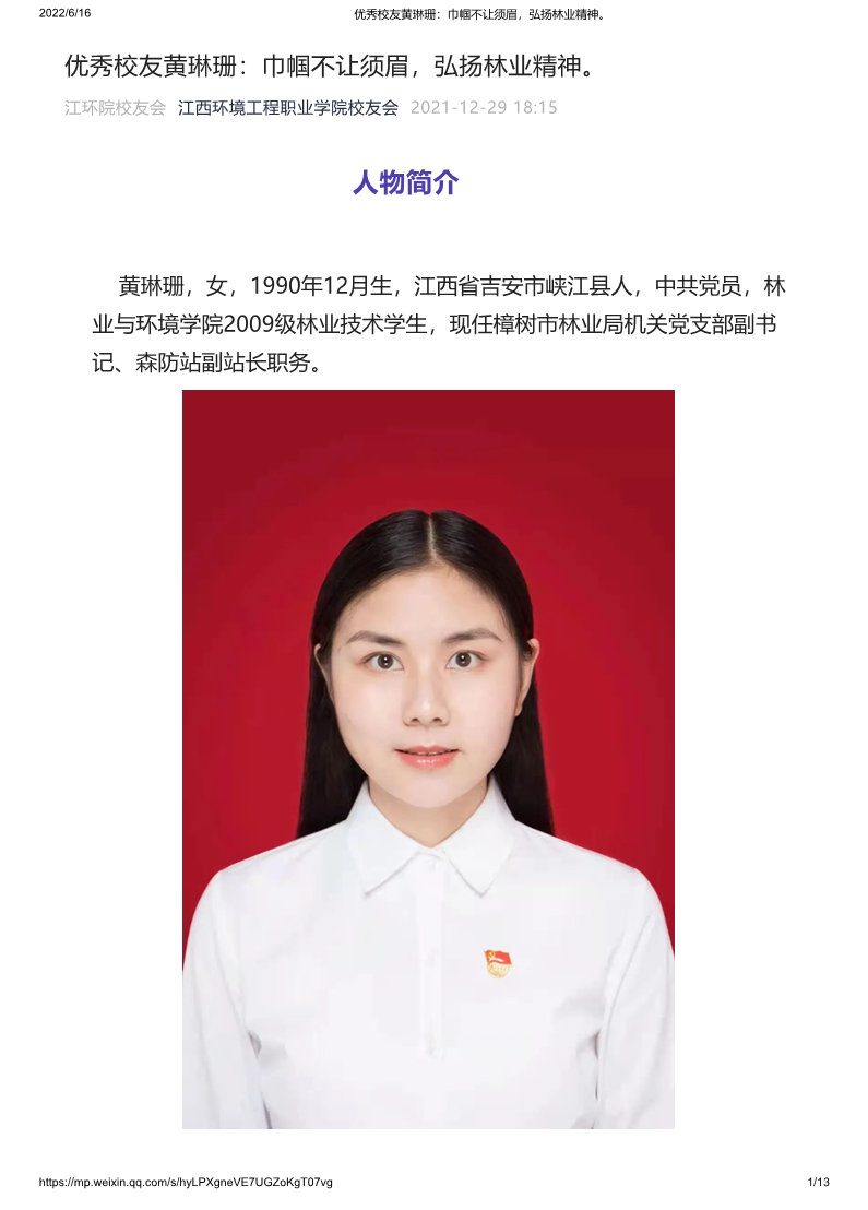 江西环境工程职业学院优秀校友黄琳珊先进事迹:巾帼不让须眉,弘扬林业精神。