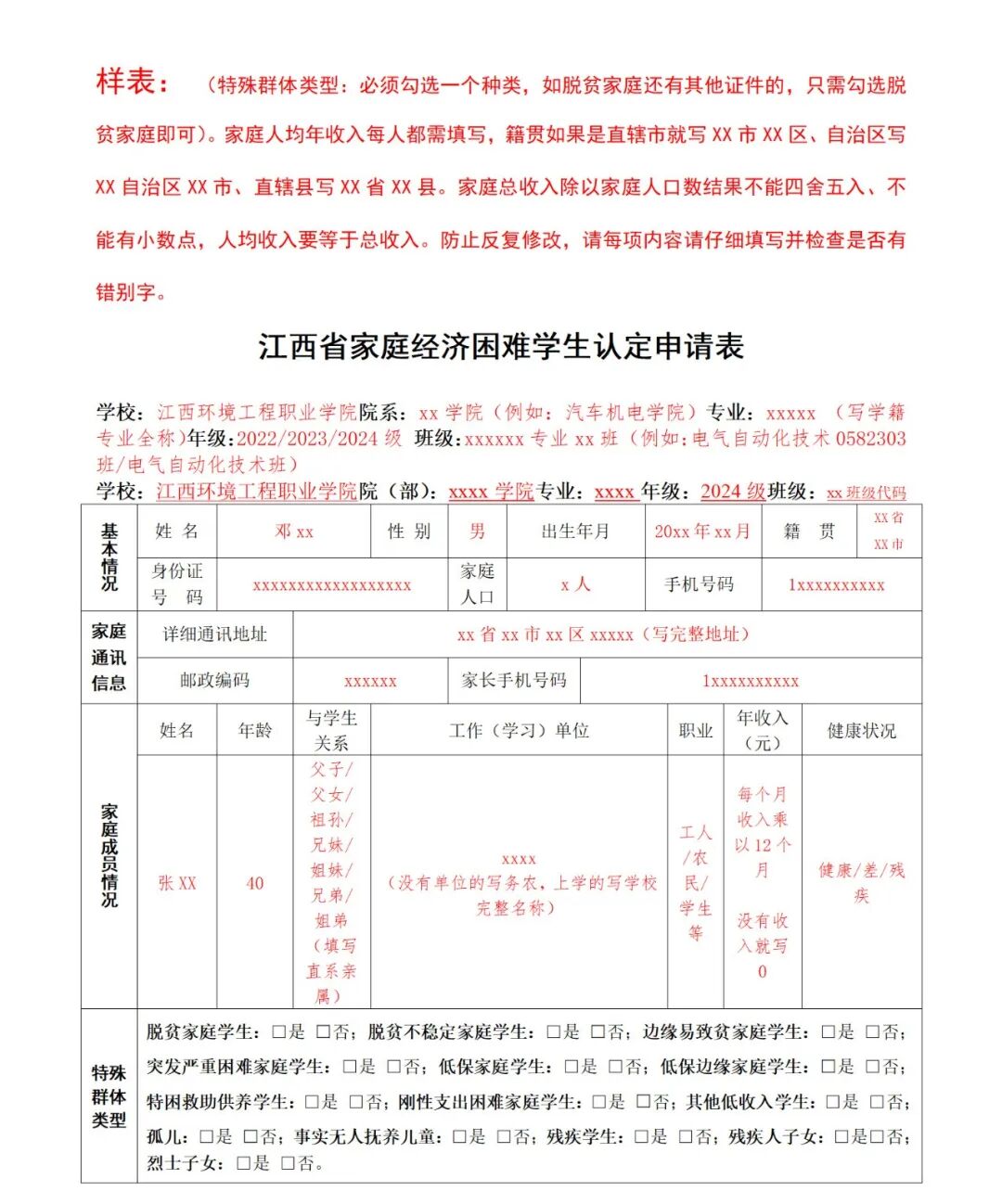 3.样表。学生可根据《江西省家庭经济困难学生认定申请表》及填写样表填写申请。