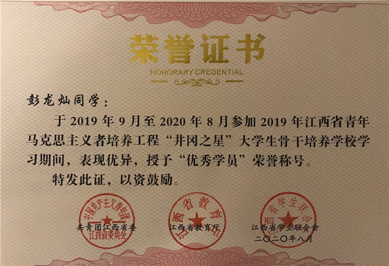 【奖项荣誉】学生彭龙灿获江西省大学生骨干培养学校 “优秀学员”称号