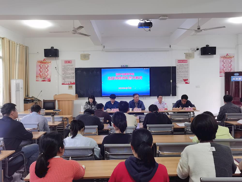 为深入贯彻两会精神,践行立德树人根本任务,进一步加强新时代教师队伍师德师风建设,全面提升教师思想政治素质和职业道德水平,园林与建筑学院于4月12日下午在设南楼203召开教职工师德师风警示教育专题会议。党委副书记宋墩福、园林与建筑学院全体教职工参加会议,会议由园林与建筑学院院长黄名广主持。